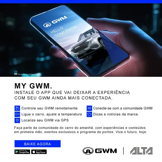 Muito prazer, somos a GWM. Uma das maiores fabricantes de automóveis do mundo e a mais nova AutoTech do Brasil. Aqui tecnologia e sustentabilidade andam juntas para criar uma nova experiência de direção. Mais limpa, mais conectada, mais livre. Descubra nossos lançamentos e prepare-se para uma nova era de mobilidade, com você no comando. O futuro chegou. Hello, tomorrow.